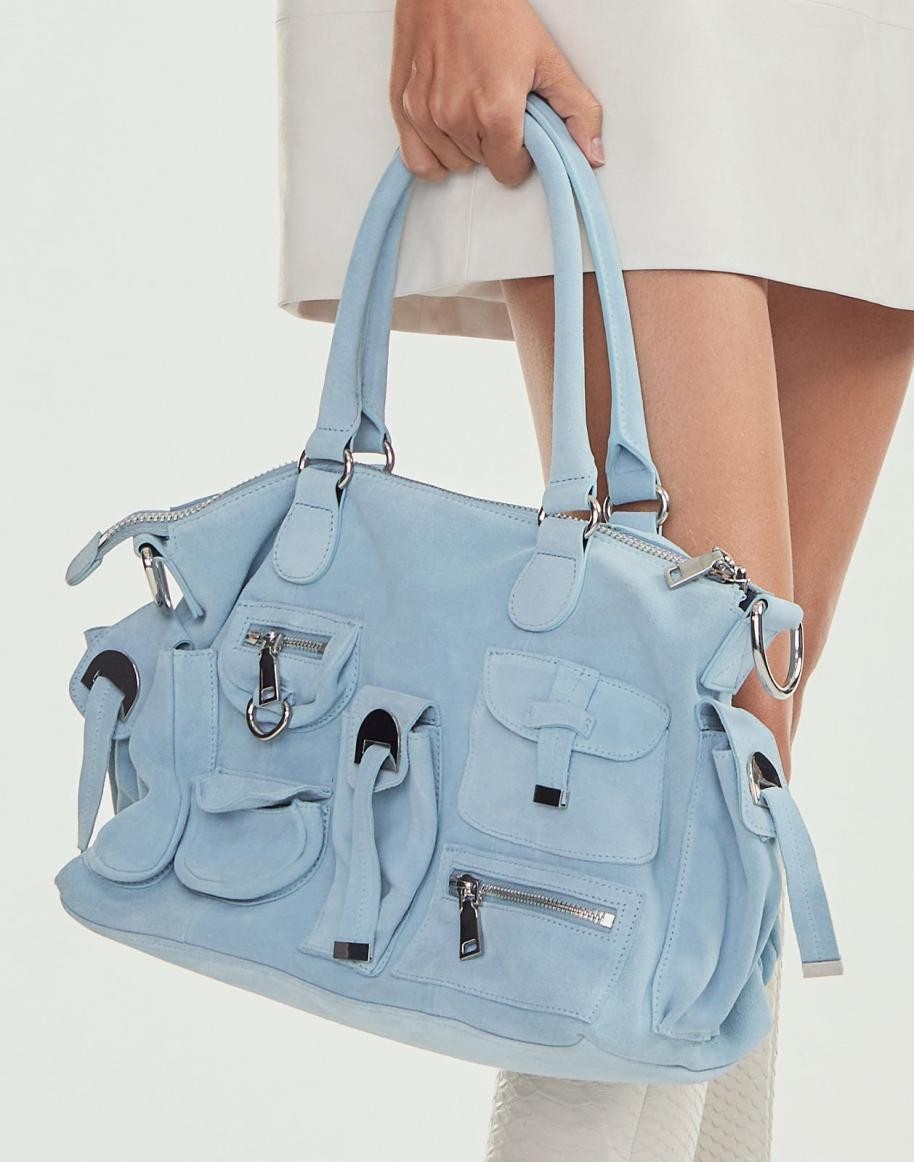 Hellblaue Schultertasche aus Wildleder mit Cargotaschen