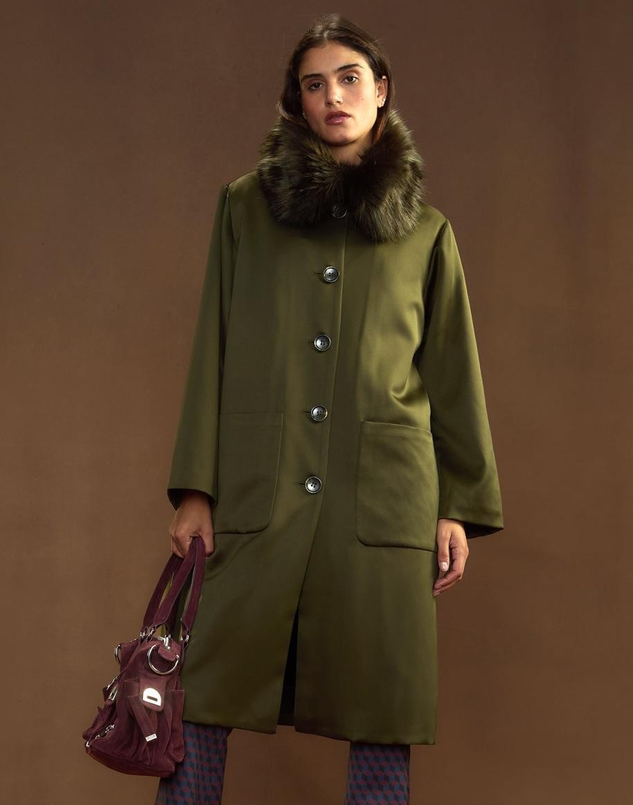 Mørk olivengrøn satinfrakke med krave i kunstpels og aftageligt for i kunstpels