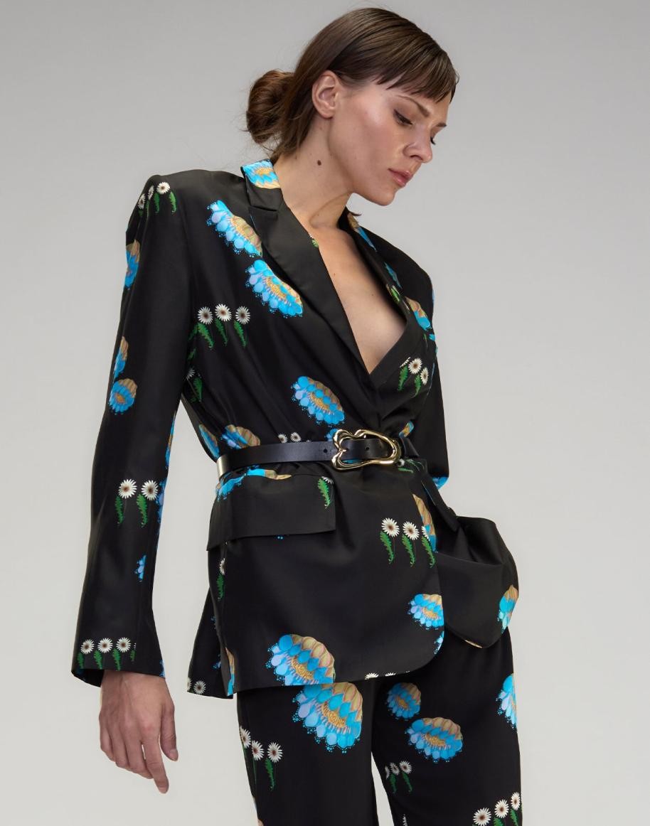 Ez a laza szabású, egysoros blézer bevágott hajtókával, egyetlen elöl gombbal záródik, és zsebfedőkkel rendelkezik a letisztult, strukturált megjelenés érdekében. A mellkasi szegélyzsebek és a selyemmel borított gombos mandzsetták praktikussá teszik ezt a blézert, míg az ismétlődő kék virágmotívum érdekes elemet ad a dizájnnak.