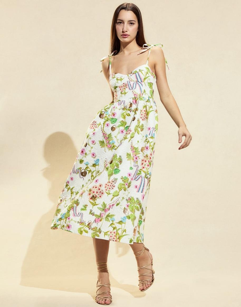 Do chéad obsession samhraidh eile. Tá strapaí spaghetti inchoigeartaithe agus muineál cothrom ar an ngúna brocaide priontáilte luibheolaíoch seo.