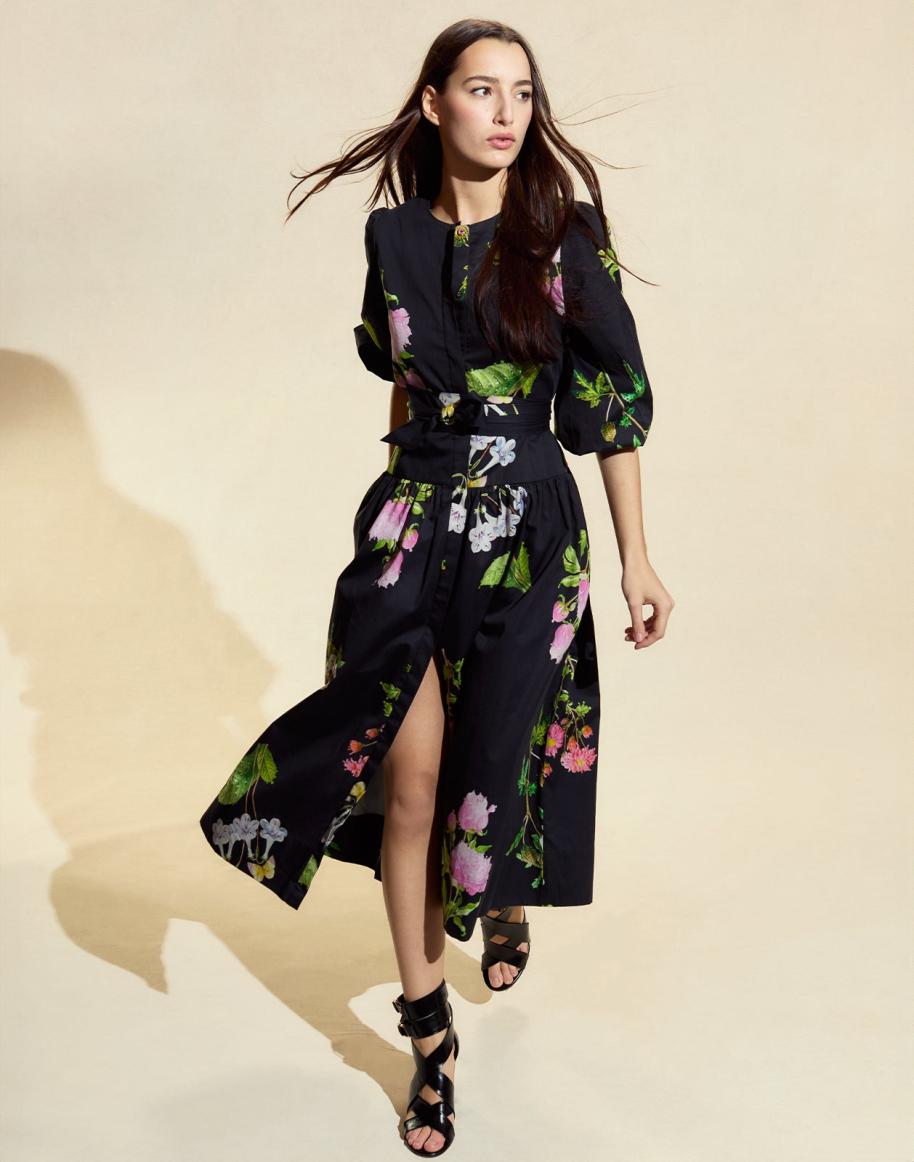 Svart skjortklänning i bomullssatin med blommotiv